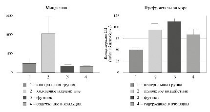 В ответ на различные виды стресса получены различные показатели концентрации HIF1α в исследуемых отделах мозга до и после стрессового воздействия и его полное отсутствие в периферической крови (см. рисунок). Наибольшее увеличение концентрации произошло в результате применения холодового стресса и методики футшок. Полное отсутствие HIF1α в периферической крови предположительно связано со скоростью развития адаптационного ответа к стрессовому воздействию.