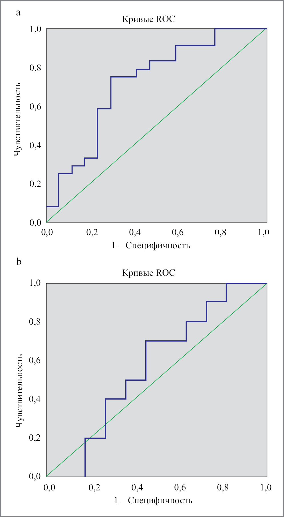 Статистический анализ выполнен при помощи программы Statistiсa 10.0. Распределение признаков оценивалось по критерию Шапиро–Уилка. При распределении, отличном от нормального, переменные представлены в виде медианы и квартильного размаха – Me (Q25; Q75). Сравнительный анализ показателей проведен с использованием критерия Манна–Уитни, корреляционный анализ – критерия Спирмена. Для оценки диагностической значимости изучаемых показателей использовали ROC-анализ. Различия считались статистически значимыми при р<0,05 для всех видов анализа.