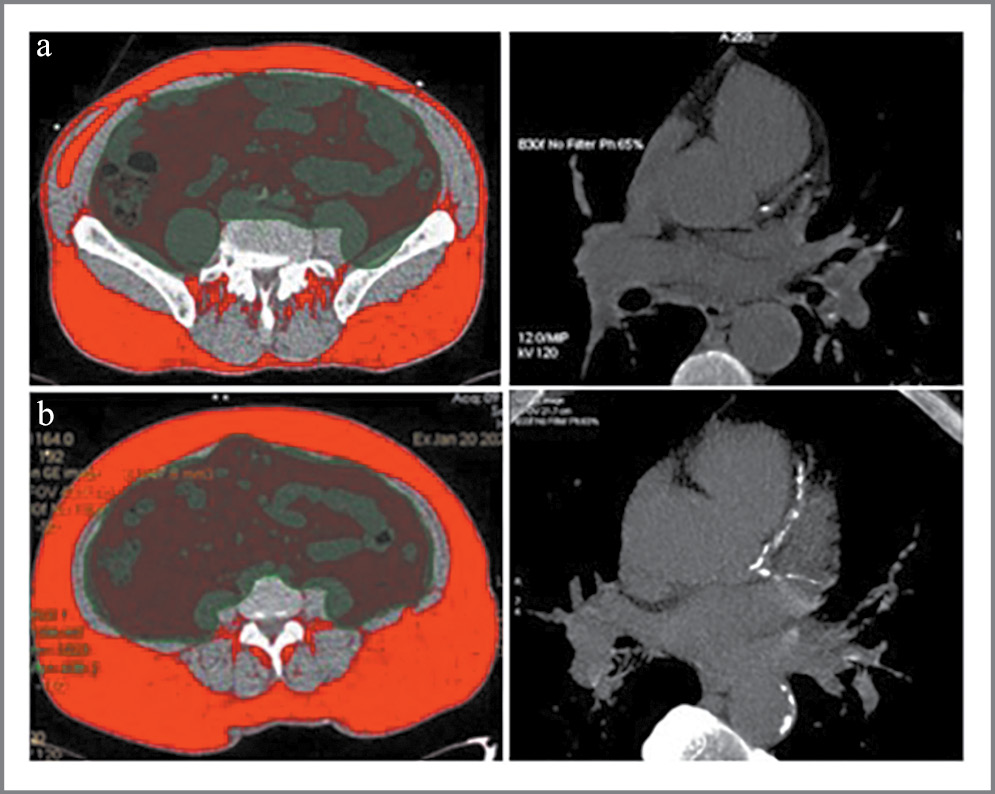 Рис. 3. Пациент А (без признаков ВО): ИМТ 31,1 кг/см2, площадь ВЖТ 126 см2, ВЖТ/ПЖТ 0,37, oбщий КК 24 AU (a). Пациент B (с признаками ВО): ИМТ 32,1 кг/см2, площадь ВЖТ 250,5 см2, ВЖТ/ПЖТ 0,68, oбщий КК 934 AU (b). / Fig. 3. Patient A (without signs of VO): BMI 31.1 kg/cm2, SVAT 126 cm2, VAT/SAT 0.37, total CC 24 AU (a). Patient B (with signs of VO): BMI 32.1 kg/cm2, SVAT 250.5 cm2, VAT/SAT 0.68, total CC 934 AU (b).