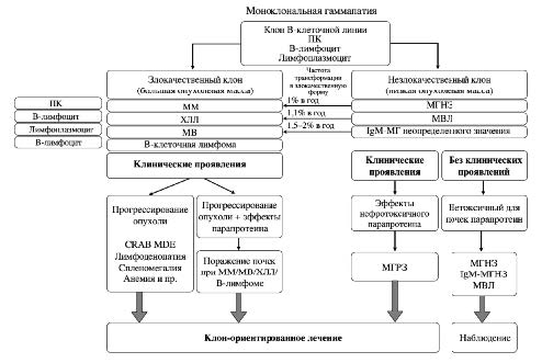 Под моноклональной гаммапатией (МГ) понимают наличие аберрантного клона В-клеточной линии дифференцировки, продуцирующего молекулу иммуноглобулина (Ig) или ее части. Современный взгляд в отношении группы нозологий, обусловленных МГ, и место МГРЗ в классификации представлены на рис. 1. Клон – популяция клеток, возникшая из одной клетки-предшественницы и наследующая все ее свойства, в том числе способность продуцировать моноклональный парапротеин. Вырабатываемый моноклональный белок, называемый парапротеином, или М-протеином, может обладать патологическими свойствами, которые реализуются различными путями, включая депозицию в органах и тканях, приводя к их повреждению. Клональные клетки могут продуцировать полноразмерную молекулу Ig или его часть (только легкую цепь – ЛЦ или только тяжелую цепь). Возможны случаи с продукцией двух изотипов ЛЦ, двух и более полноразмерных Ig. В зависимости от этапа дифференцировки В-клеток клональную пролиферацию можно разделить на: