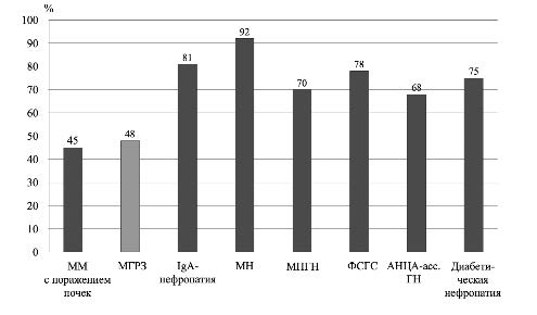 Примечание. АНЦА-асс. ГН – гломерулонефрит, ассоциированный с антителами к цитоплазме нейтрофилов, МПГН – мембранопролиферативный ГН, МН – мембранозная нефропатия, ФСГС – фокально-сегментарный гломерулосклероз.