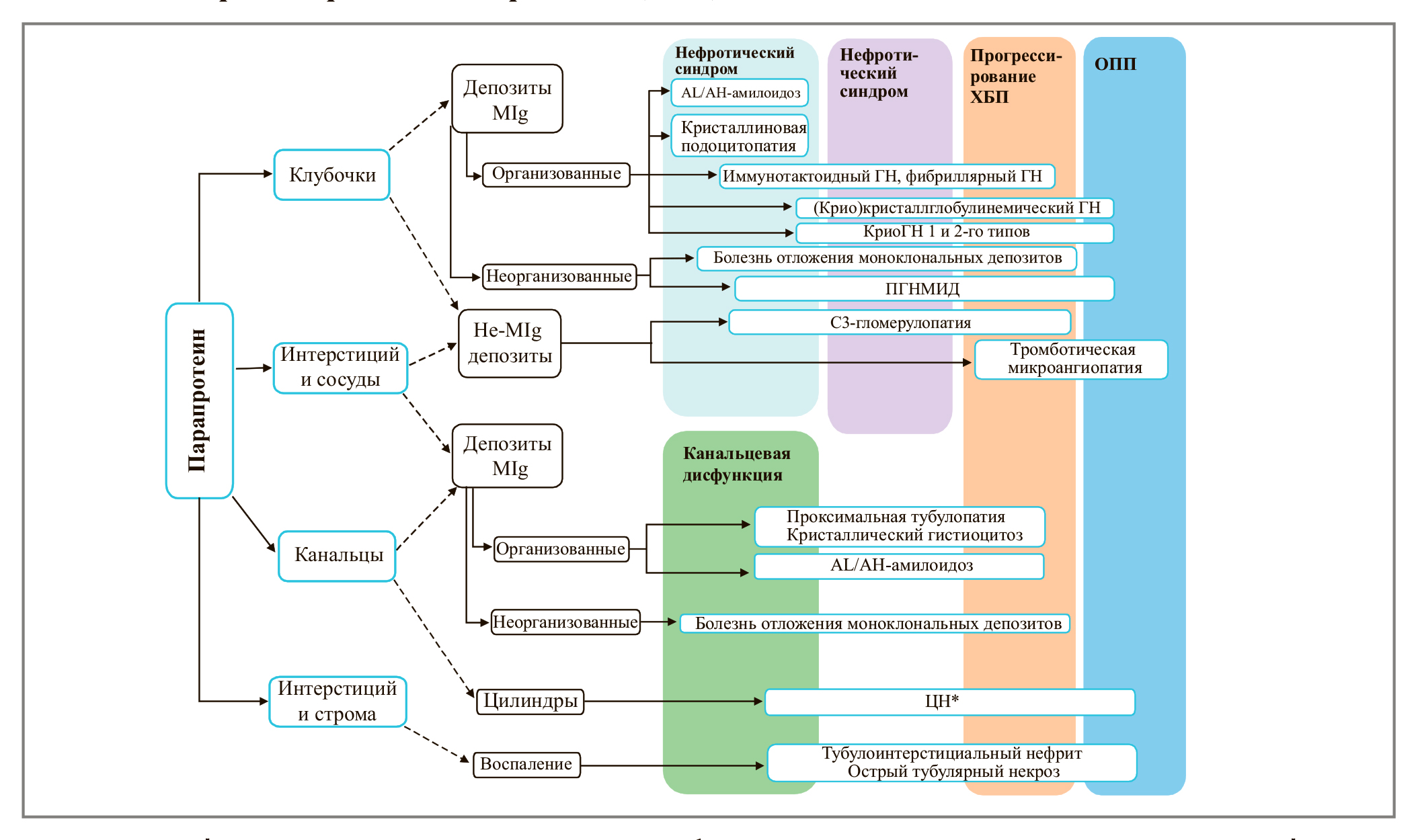 Примечание. К вариантам повреждения почек, связь которых с МГ пока не имеет достаточной доказательной базы, относят: ГН, ассоциированный с антителами к гломерулярной базальной мембране (анти-ГБМ ГН); МН, в том числе ассоциированную с антителами к рецептору фосфолипазы А2; IgA-нефропатию при болезни Шенляйна–Геноха, ассоциированную с MIg [2]. ПГНМИД – пролиферативный ГН с отложением MIg. *ЦН в основном возникает при избыточной продукции ЛЦ при ММ, не относится к МГРЗ.