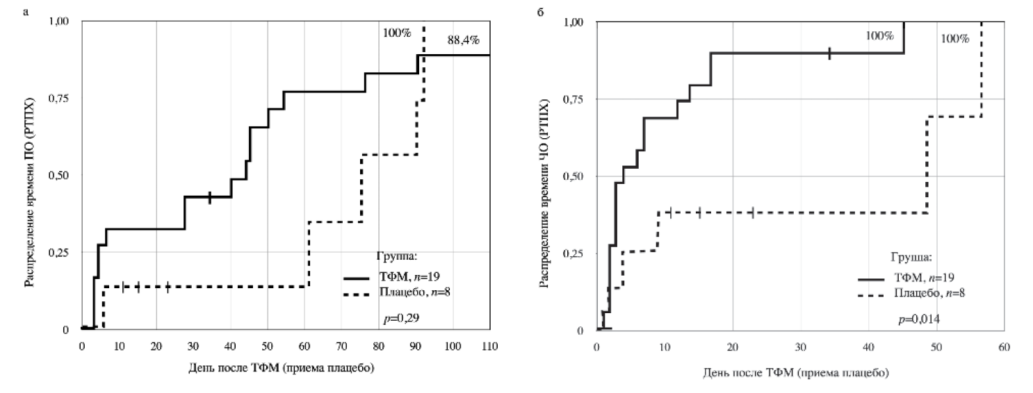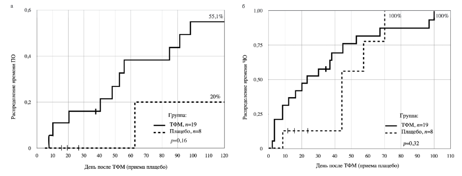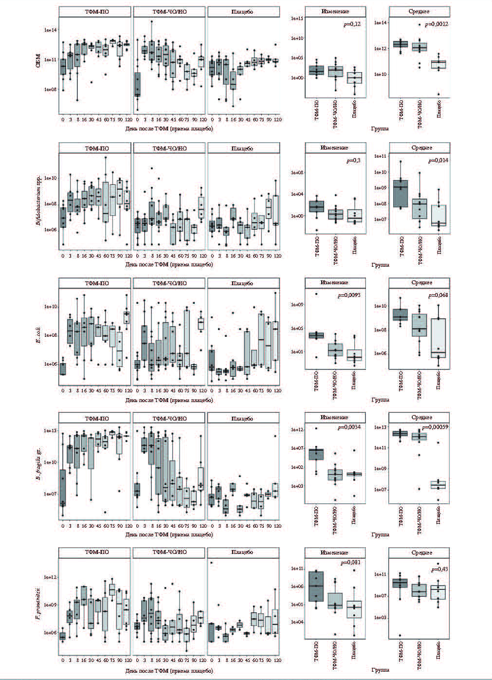 Результаты. После ТФМ по сравнению с группой плацебо выявлены статистически значимо более высокие средние значения общей бактериальной массы (р=0,00088), Bifidobacterium spp. (р=0,021), Escherichia coli (р=0,049) и Bacteroides fragilis gr. (р=0,000043). При этом изменения в бактериальной массе наблюдались у пациентов с клиническим ответом (р=0,0057), а бактериальная масса у пациентов без полного ответа сопоставима с группой плацебо (р=0,31). Частичный ответ по тяжести РТПХ достигался быстрее в группе ТФМ, чем в группе плацебо (медиана 4 дня против 48 дней; р=0,014). Полный ответ наблюдался у 8 (42%), 14 (74%) и 16 (84%) больных через 30, 60 и 90 дней в группе ТФМ соответственно против 0%, 1 (13%) и 4 (50%) в группе принимавших плацебо. Частота и выраженность нежелательных явлений после ТФМ сопоставима с группой плацебо.