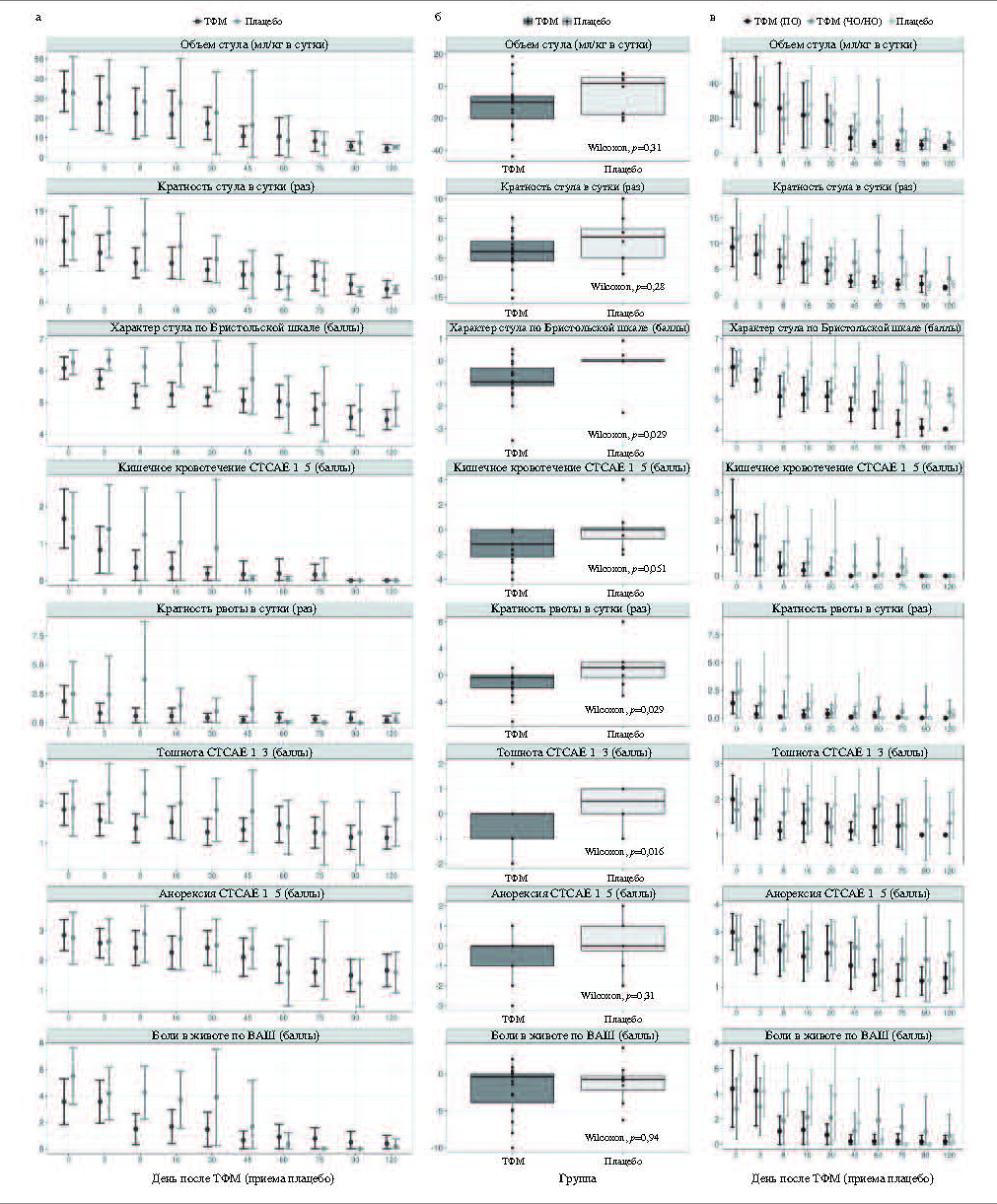 Пациенты или их родители вели дневник, где ежедневно оценивали жалобы и выраженность симптомов. Динамику клинических симптомов оценивали согласно шкале общих терминологических критериев неблагоприятных событий CTCAE (Common Terminology Criteria for Adverse Events) Version 5.0 [20]: анорексия (1–5 баллов), тошнота (1–3 балла), кровотечение из нижних отделов желудочно-кишечного тракта – ЖКТ (1–5 баллов). Болевой синдром (боли в животе) оценивали по 10-балльной визуальной аналоговой шкале (ВАШ) [21, 22]. Регистрировали кратность, объем диареи и рвоты в сутки. Характер стула оценивали по Бристольской шкале от 1 до 7 баллов. В дни исследования: до ТФМ/плацебо, Д+3, Д+8, Д+16, Д+30, Д+45, Д+60, Д+75, Д+90, Д+120 использовали среднее значение всех показателей начиная с первого дня после предыдущей точки до исследуемого дня включительно.