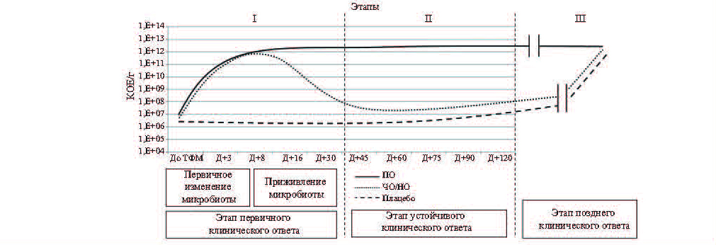 Этот этап относится исключительно к группе с полным клиническим ответом. Таким образом, у пациентов из группы ТФМ-ПО зарегистрировано совпадение клинического и микробиологического ответов. Скорее всего, следует ожидать начала изменений со стороны метаболизма, иммунные сдвиги и как следствие – улучшение клинической картины РТПХ с поражением кишечника, а также эффект деколонизации УПМ и инфекции, связанной с C. difficile [32].