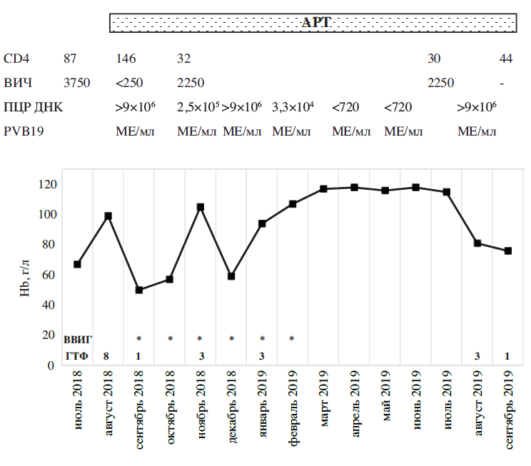 Мы приводим случай ВИЧ-инфицированной пациентки с PVB19, у которой, несмотря на одновременное применение АРТ и внутривенного нормального человеческого иммуноглобулина (ВВИГ), CD4 прогрессивно уменьшались без элиминации PVB19.