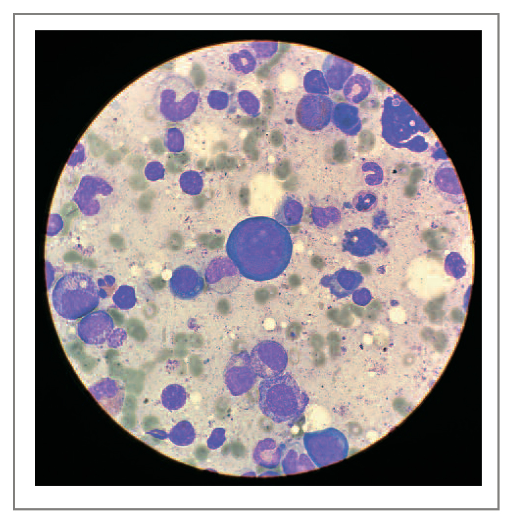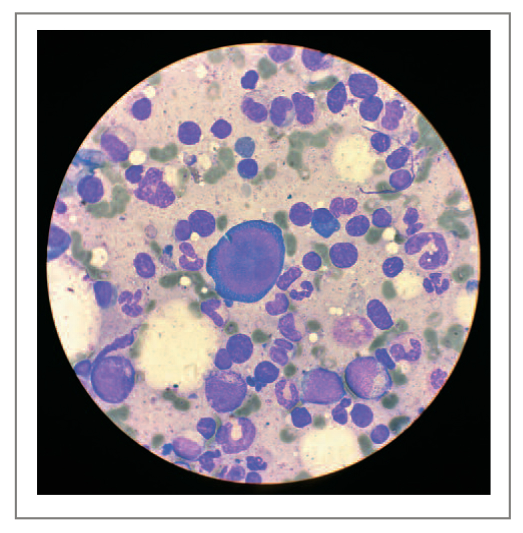 Рис. 1. Мазок костного мозга, окрашенный по Романовскому–Гимзе: в центре гигантский пронормобласт с внутриядерными включениями парвовируса и интенсивно синей цитоплазмой (оригинальное увеличение ¥100).
