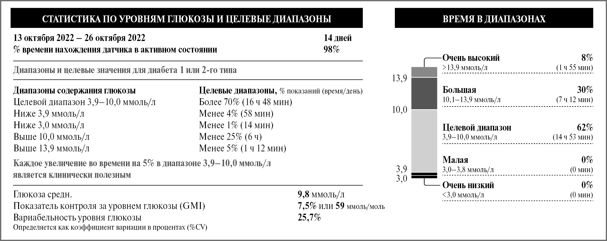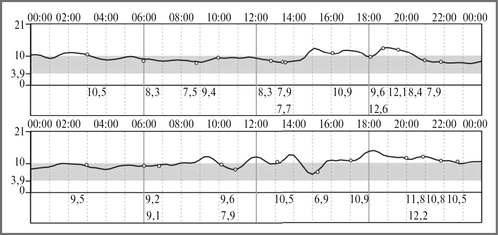 В течение первого года после СТПиПЖ отмечалось повышение препрандиальной гликемии до 8 ммоль/л, постпрандиальной – до 11 ммоль/л, после отмены метилпреднизолона, уменьшения дозы такролимуса и инициации пероральной сахароснижающей терапии (вилдаглиптин 50 мг/сут) достигнута эугликемия (HbA1c – 5,5%). С 2014 г. – дисфункция донорской ПЖ, поэтому была возобновлена базис-болюсная инсулинотерапия. Показатели углеводного обмена в июле 2022 г.: С-пептид – 1,1 нг/мл, HbA1c – 8,7%. После интенсификации инсулинотерапии в октябре 2022 г.: С-пептид – 0,6 нг/мл, HbA1c – 8%, что не соответствует индивидуальному целевому значению (менее 7,0%). На рис. 1 и 2 представлены результаты flash-мониторинга.