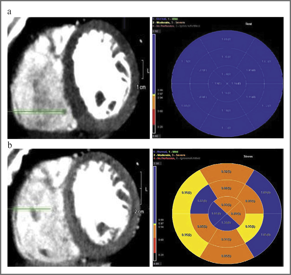 a – ОбКТ сердца с фармакологической пробой с АТФ, фаза покоя. Изображение миокарда ЛЖ в артериальную фазу контрастирования, поперечный срез на уровне средних сегментов, и детализированная полярная карта распределения КТП. Субэндокардиальные дефекты перфузии миокарда ЛЖ не определяются. Значение КТП во всех сегментах миокарда ЛЖ более 0,99;