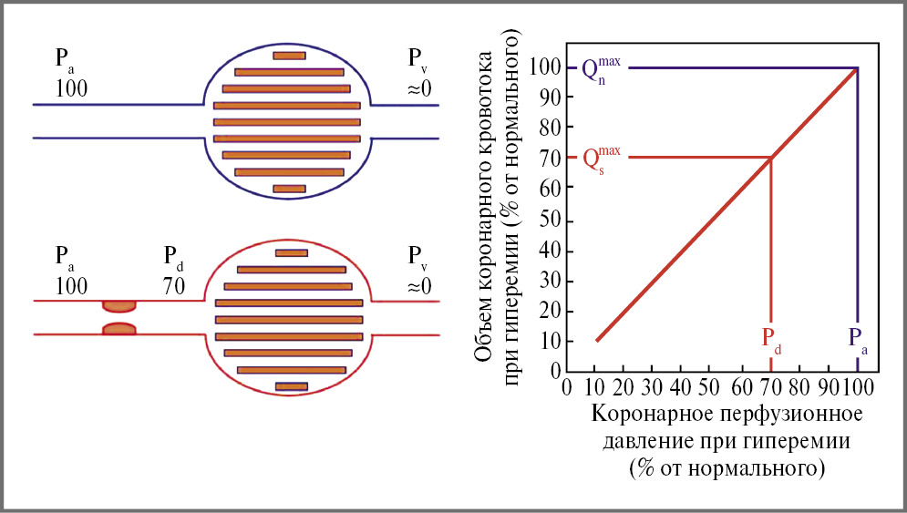Примечание. Pa – аортальное давление, Pd –давление после исследуемого стеноза, Pv – венозное давление, Qnmax – максимальный кровоток в норме, Qsmax – максимальный кровоток при наличие стеноза.