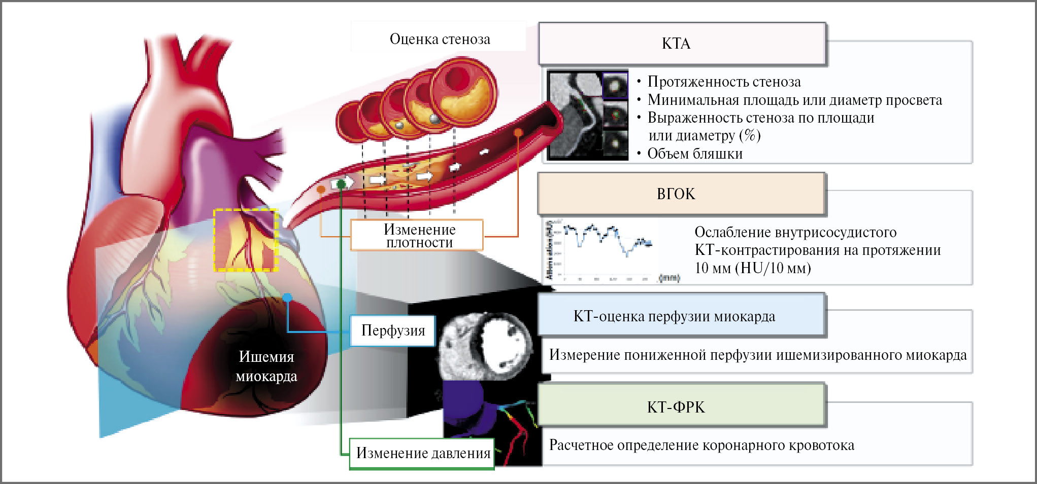 Рис. 2. Неинвазивные методы оценки ишемии миокарда: КТА, ВГОК, КТ-оценка перфузии миокарда, КТ-ФРК [17].
