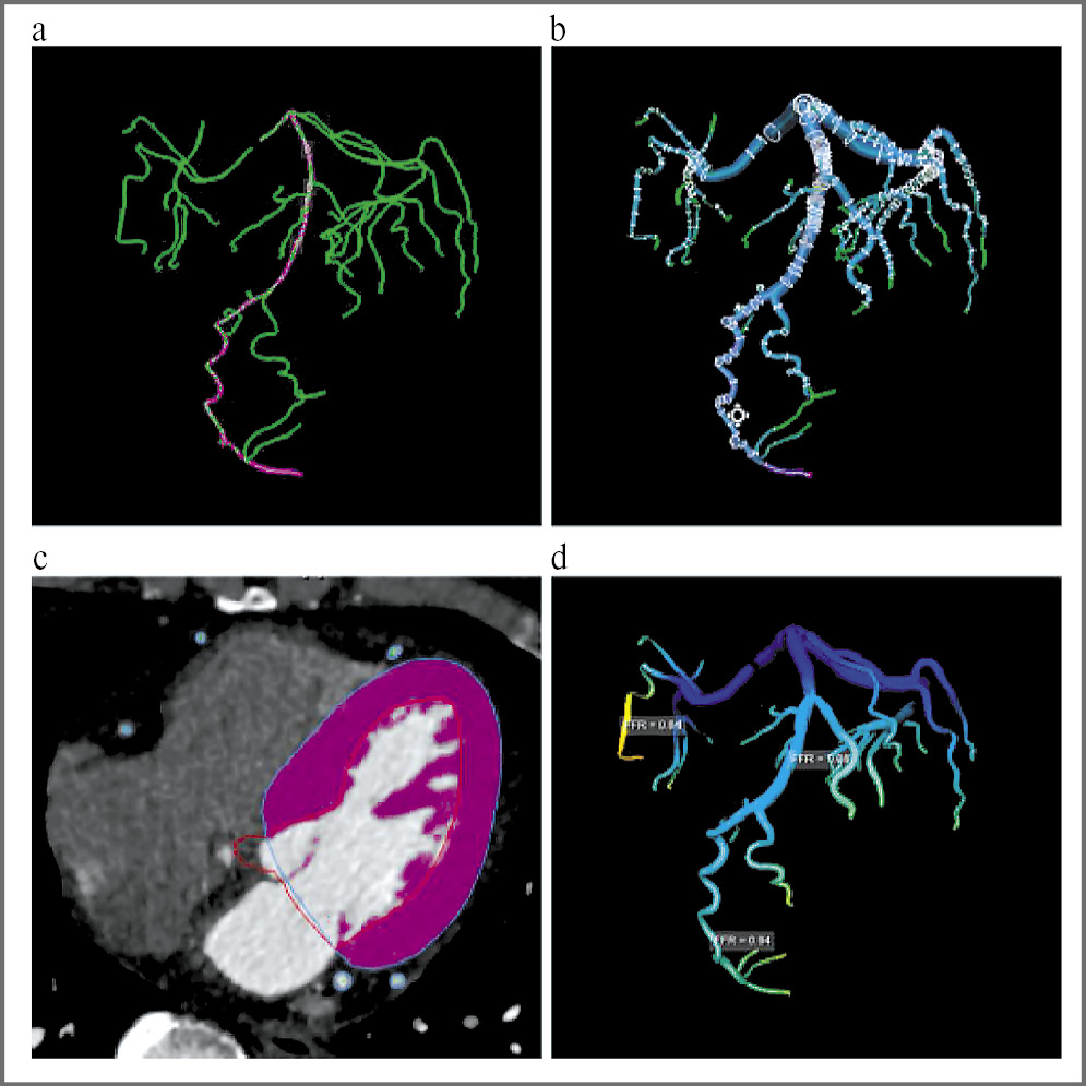 Рис. 3. Определение ФРК с использованием МСКТ (КТ-ФРК) : а – первым этапом создается схема осевого хода коронарных артерий с использованием программного обеспечения рабочей станции; b – на втором этапе после реконструкции просвета коронарных артерий конфигурация сосудистого русла может несколько измениться; c – после получения информации о массе миокарда производится расчет и реконструкция КТ-ФРК (d).