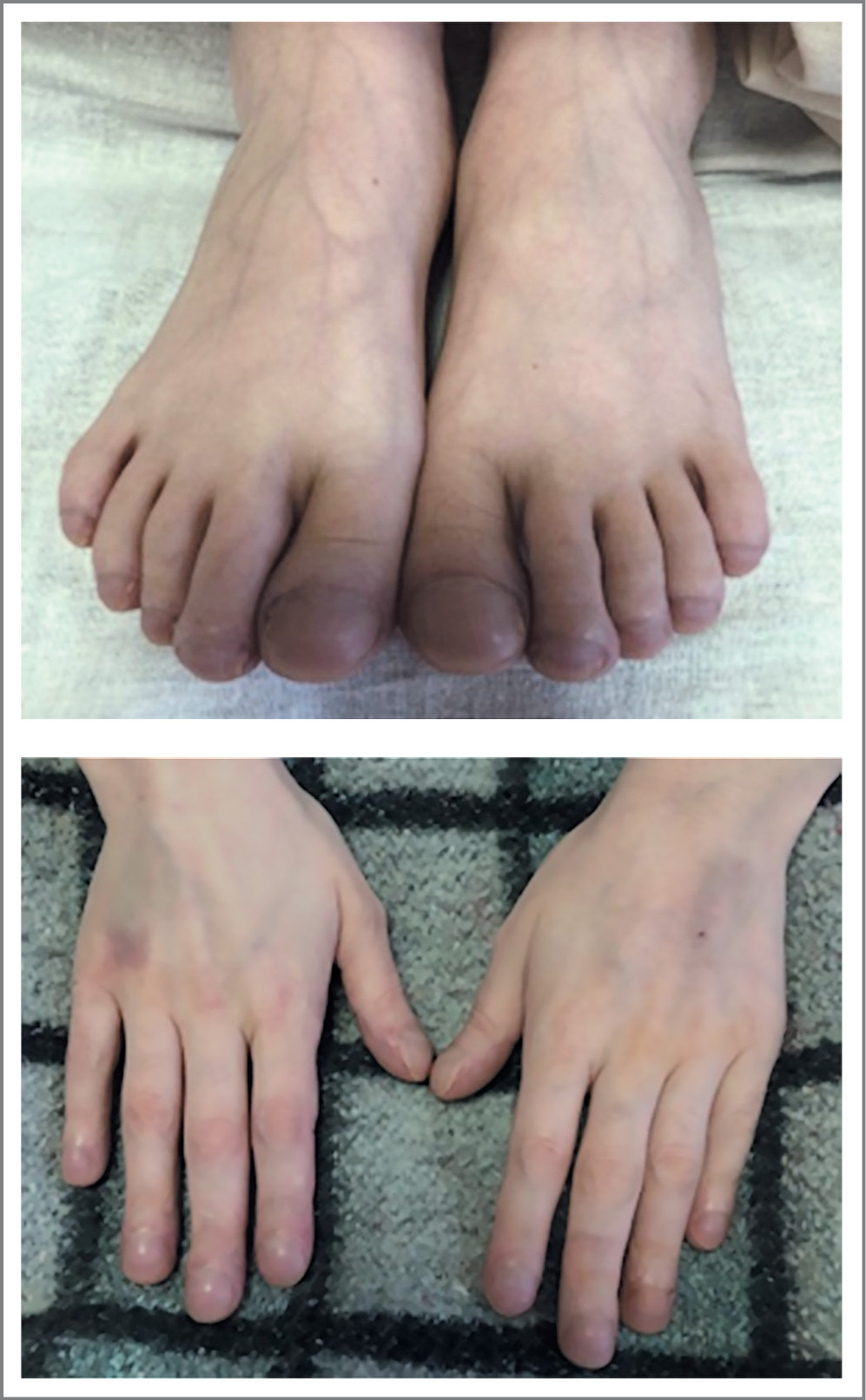 Общее состояние тяжелое. Инфантильность. Внешне выглядит моложе своих лет, лицо одутловатое. Сознание ясное, во времени, пространстве и личности ориентирована. Положение тела вынужденное, ортопноэ: сидя с приподнятым изголовьем из-за одышки. Дефицит массы тела. Индекс массы тела 16,22 кг/м2 (рост 136 см, вес 30 кг). Кожные покровы и видимые слизистые оболочки бледно-цианотичного цвета, обычной влажности, чистые. Отеков нет. Периферические лимфатические узлы не пальпируются. Ногтевые фаланги в виде барабанных палочек, ногтевые пластины по типу часовых стекол (рис. 1). Температура тела от 37,8 до 39°С.