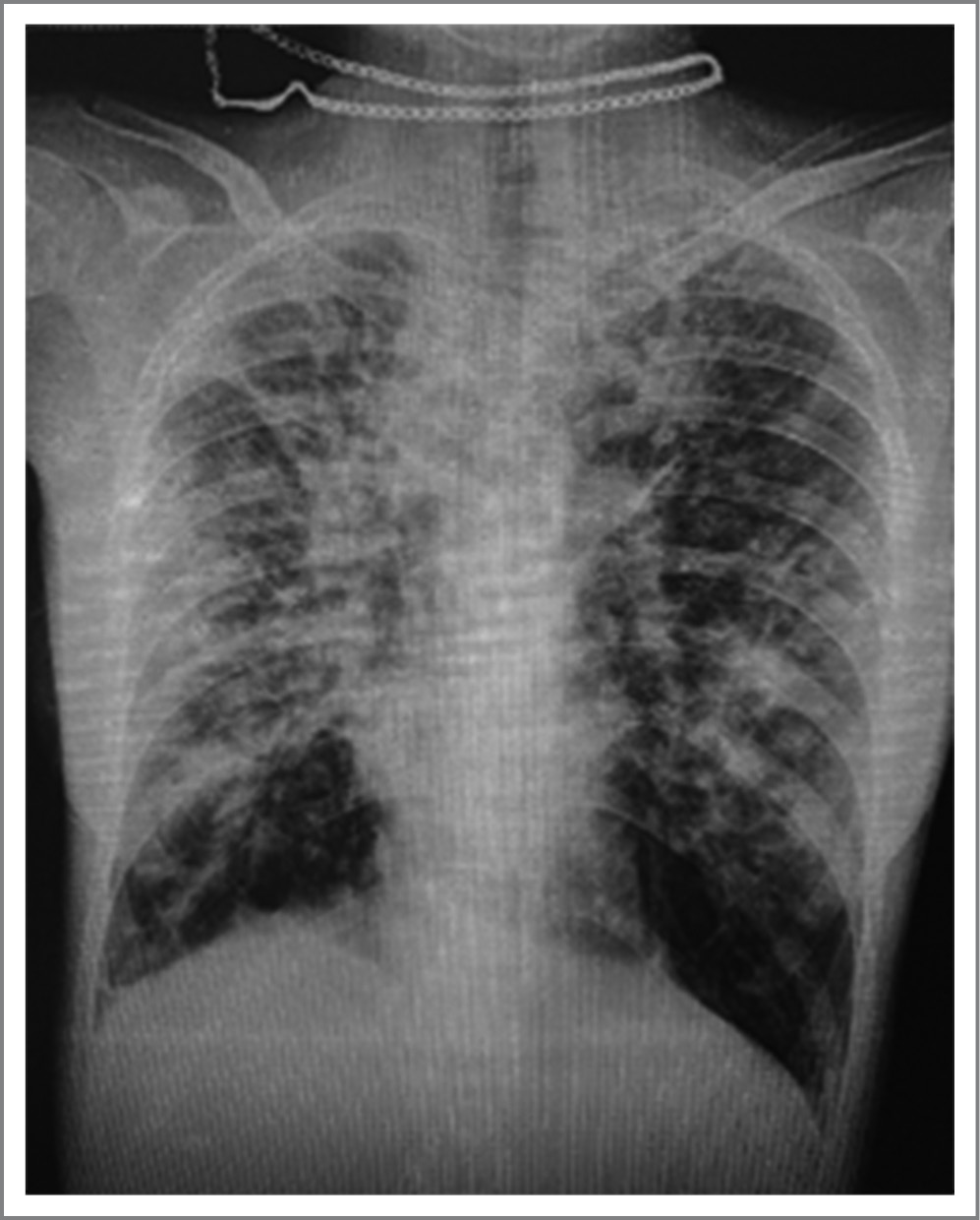 Рентгенография ОГК – R-картина может соответствовать двусторонним бронхоэктазам, кистозным изменениям легких (рис. 2).