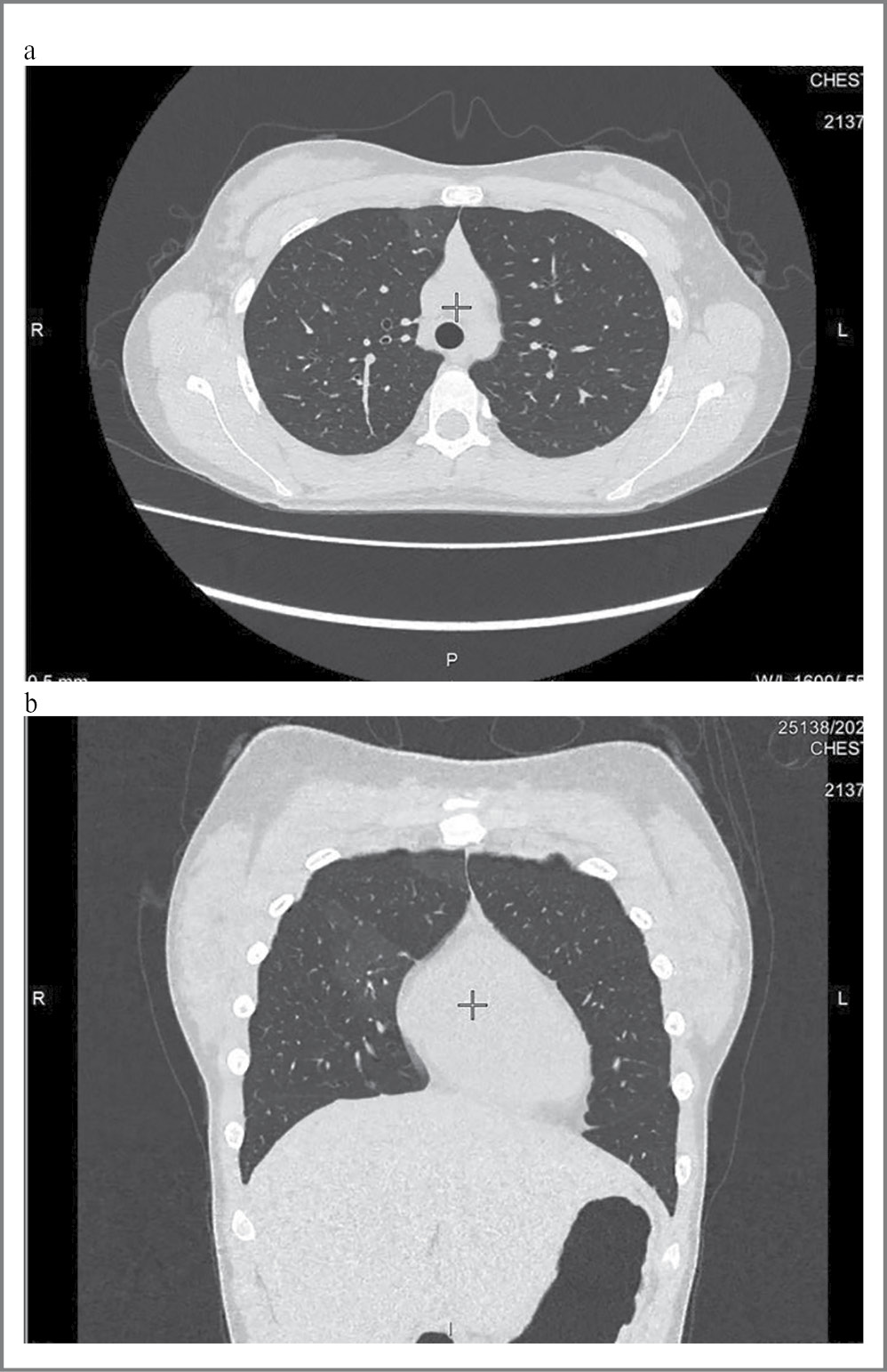 Рис. 1. КТ органов грудной клетки: a – аксиальный срез; b – корональный срез.