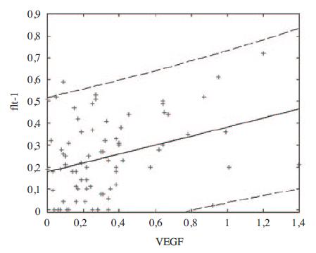 Рис. 1. Корреляция уровней экспрессии мРНК VEGF и flt-1.