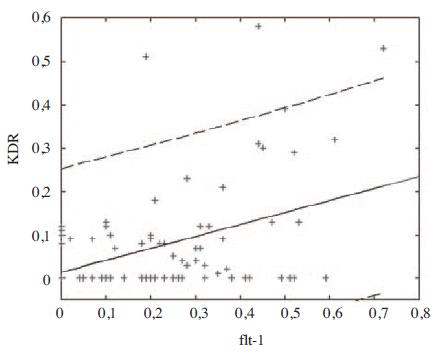 Рис. 3. Корреляция уровней экспрессии мРНК flt-1 и KDR.