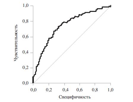 На рис. 3 изображена ROC-кривая полученной модели логистической регрессии. В качестве зависимой переменной принималось КИ-ОПП. Площадь под кривой AUC составила 0,742 (p<0,0001, 95% ДИ 0,696–0,788). Общее количество верно классифицированных случаев с использованием модели – 87,29%. Прогностичность отрицательного результата составила 87,27%, а прогностичность положительного результата – 100%. Модель включала следующие факторы риска: женский пол, возраст, ИМТ, массу тела, наличие артериальной гипертензии, исходный уровень сывороточного креатинина. При этом из всех перечисленных факторов в логистической регрессионной модели статистически значимым являлся именно исходный уровень сывороточного креатинина (p<0,0001, 95% ДИ 0,938–0,964, ОШ 0,95). Логистические регрессионные модели, включавшие в качестве переменной наличие СД, обладали меньшей статистической значимостью, меньшей AUC. Сам параметр также в ходе проведения многофакторного анализа не мог быть классифицирован как значимый и в дальнейшем исключен из моделей.