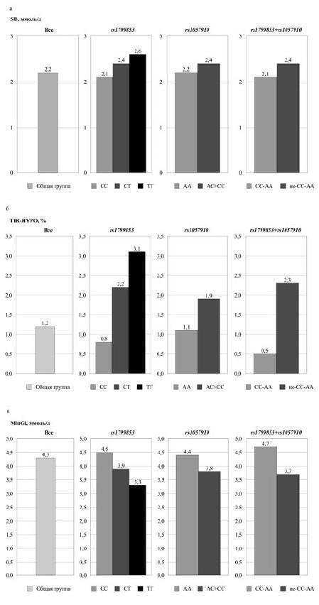Представлены корреляции между развитием гипогликемии и носительством полиморфных маркеров гена CYP2C9. Показано, что носительство каждого из полиморфизмов оказывает влияние на печеночный метаболизм ПСМ и, соответственно, вносит фармакогенетический вклад в эффективность сахароснижающей терапии СД 2. Превалирующим является вклад полиморфного маркера rs1799853 в сравнении с rs1057910. Установлено, что носительство rs1799853 и rs1057910 гена CYP2C9 статистически достоверно значимо увеличивает риск развития гипогликемии у пациентов с СД 2, принимающих ПСМ. Основные результаты исследования «случай-контроль» представлены в табл. 2. Стратификация основных показателей, характеризующих развитие гипогликемий, и вариабельности гликемии в зависимости от носительства полиморфных маркеров визуализирована на рисунке.