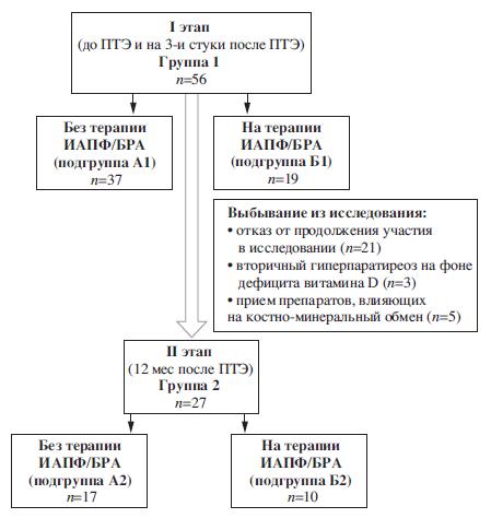 Проведено двухэтапное сравнительное исследование пациентов с верифицированным диагнозом ПГПТ, установленным на основании повышения уровня интактного ПТГ, общего и альбуминскорректированного кальция (при двукратном измерении), соотношения клиренса кальция и креатинина более 0,01, и группы здорового контроля. Первый этап включал обследование 56 пациентов (группа 1) до проведения хирургического лечения и на 3-и сутки после ПТЭ с дополнительной оценкой состояния РААС. Второй этап исследования проводился через 12 мес после ПТЭ у 27 пациентов с ремиссией ПГПТ (группа 2). Группа здорового контроля включала 27 добровольцев, сопоставимых по возрасту и полу, без патологии ОЩЖ и сердечно-сосудистых заболеваний. Схема обследования пациентов, участвующих в исследовании, представлена на рис. 1.