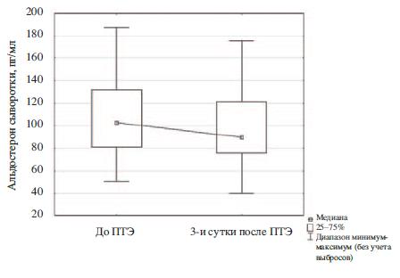 В группе 1 на 3-и сутки после ПТЭ зафиксированы статистически значимое снижение уровня альдостерона сыворотки (p=0,009) и тенденция к снижению АРП (p=0,030) при отсутствии значимого изменения АТ II (р=0,070); табл. 1.
