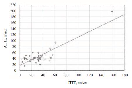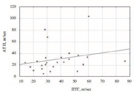 Рис. 4. Взаимосвязь показателей ПТГ и АТ II в группе 2 через 12 мес после ПТЭ (р=0,030; r=0,42; метод Спирмена).