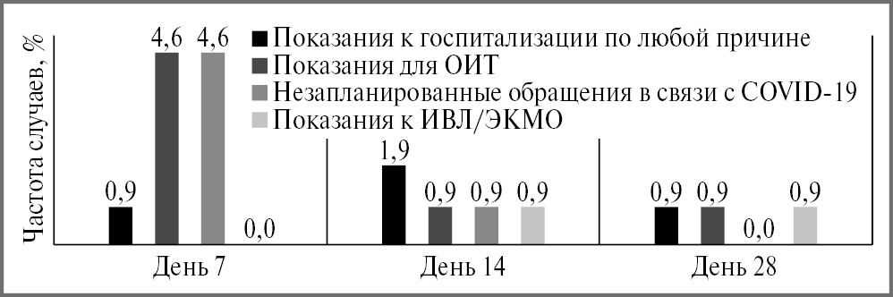 Анализ частоты незапланированного обращения за медицинской помощью в связи с COVID-19 показал, что в течение 1-й недели исследования обращения зарегистрированы в 4,6% (n=5) случаев, в течение 2-й – в 0,9% (n=1). К 28-му дню наблюдения незапланированные обращения за медицинской помощью не зарегистрированы.