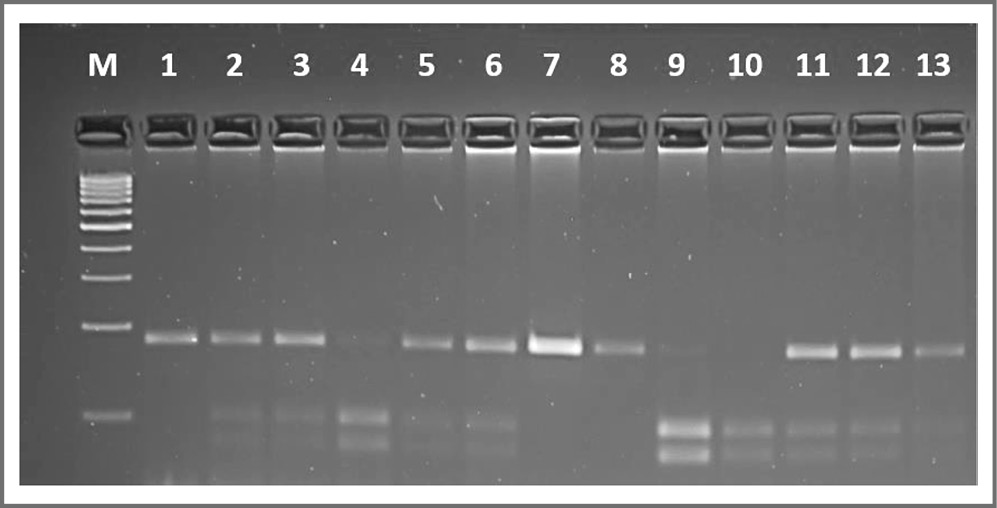 Экстракция ДНК из образцов замороженной цельной крови проведена с помощью набора Newteryx (г. Якутск, Россия). Концентрацию и качество выделенной ДНК измеряли на спектрофотометре NanoPhotometer® производства Implen (Германия). Генотипирование проводили с использованием метода классической полимеразной цепной реакции с анализом полиморфизма длин рестрикционных фрагментов (ПДРФ) [10]. Детекцию ПДРФ продуктов проводили с помощью горизонтального электрофореза в пластине 4% агарозного геля, окрашенного бромистым этидием, с использованием стандартного трис-ацетатного буфера при 120 В в течение 45 мин. Визуализацию рестрикционных продуктов проводили в ультрафиолетовых лучах c использованием гель-документирующей системы (Vilber Lourmat, Франция); рис. 1.