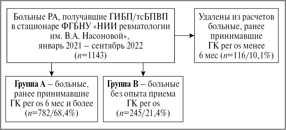 В анализ включены 1143 госпитализированных в стационар пациента с активным РА (ACR/EULAR 2010 г.), не ответивших на традиционные БПВП и нуждающиеся в назначении/возобновлении/смене генно-инженерных биологических препаратов (ГИБП) или таргетных синтетических БПВП (тсБПВП).