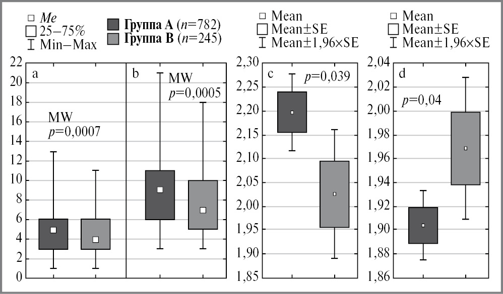 Сравнение мультиморбидной «нагрузки» на РА имеющимися у пациентов сопутствующими заболеваниями показало, что при длительном приеме ГК наблюдалось большее количество вовлеченных в патологический процесс категорий систем и органов (рис. 2, а), а также индекс мультиморбидности CIRS (рис. 2, c). Однако, несмотря на более старший возраст, индекс тяжести CIRS (рис. 2, d) у них был ниже, чем у пациентов группы В.