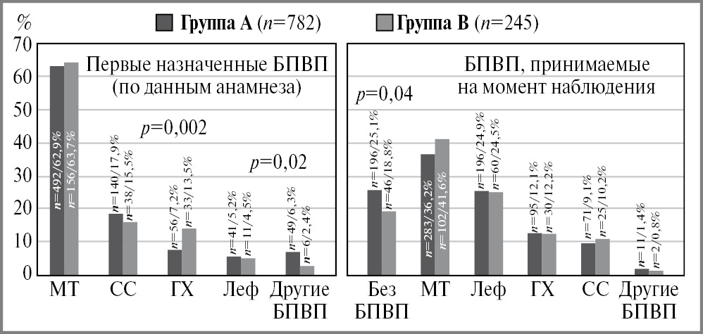 На момент исследования структура БПВП в группах была сопоставима (рис. 3), но при длительном приеме ГК 1/4 больных «обходились» без БПВП. Количество ранее использованных БПВП в группе А было большим (р=0,0003), чем среди пациентов группы В (2,7±1,1 и 2,4±0,9 соответственно). В обеих группах первым назначаемым БПВП чаще всего являлся метотрексат (МТ). На фоне длительного приема ГК нежелательные реакции (НР) на МТ в виде тошноты и рвоты, потребовавшие снижения дозы или отмены препарата, наблюдалась реже, чем в группе В [отношение шансов 0,5 (0,3; 0,6); р<0,0001]. С другой стороны, НР в виде повышения печеночных трансаминаз, потребовавшие временной или окончательной отмены МТ, в группе А отмечались достоверно чаще, чем в группе В [отношение шансов 1,6 (1,0; 2,6); р=0,03].