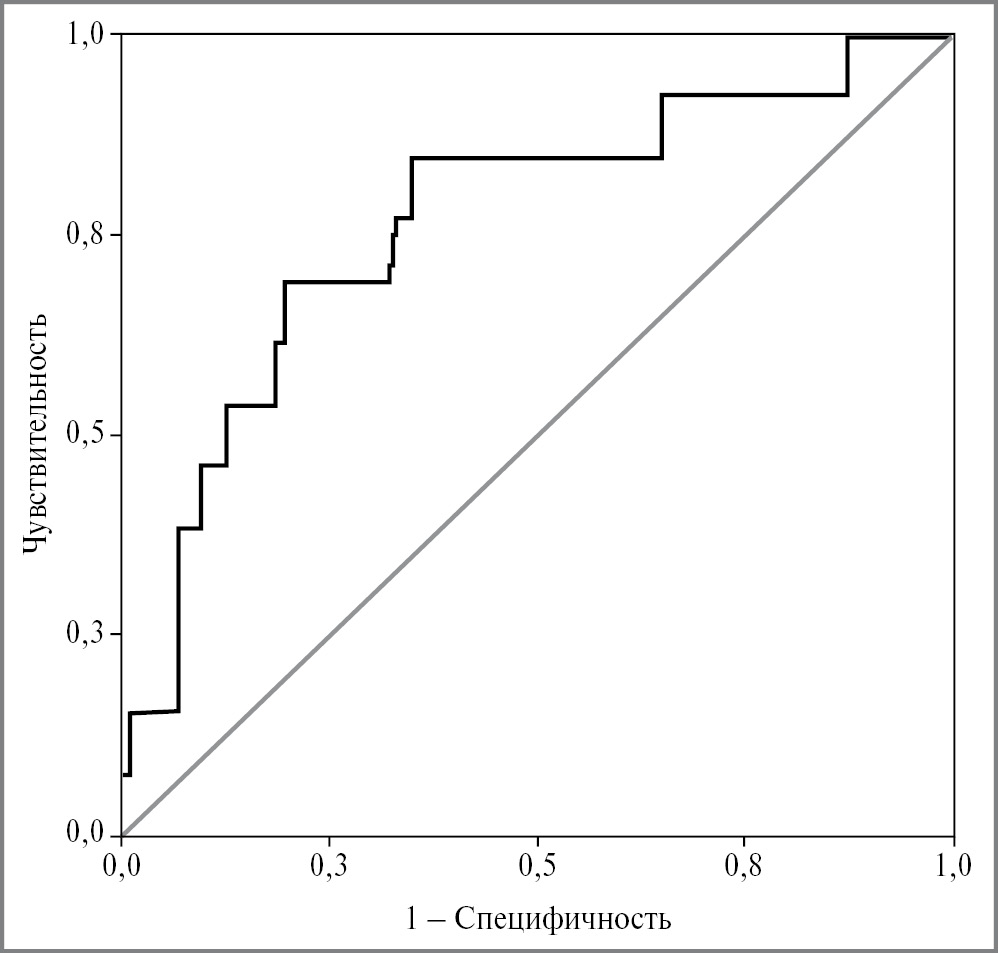 ROC-анализ чувствительности и специфичности модели продемонстрировал высокую точность индекса: площадь под ROC-кривой составила 0,768, 95% доверительный интервал 0,624–0,913; рис. 2.