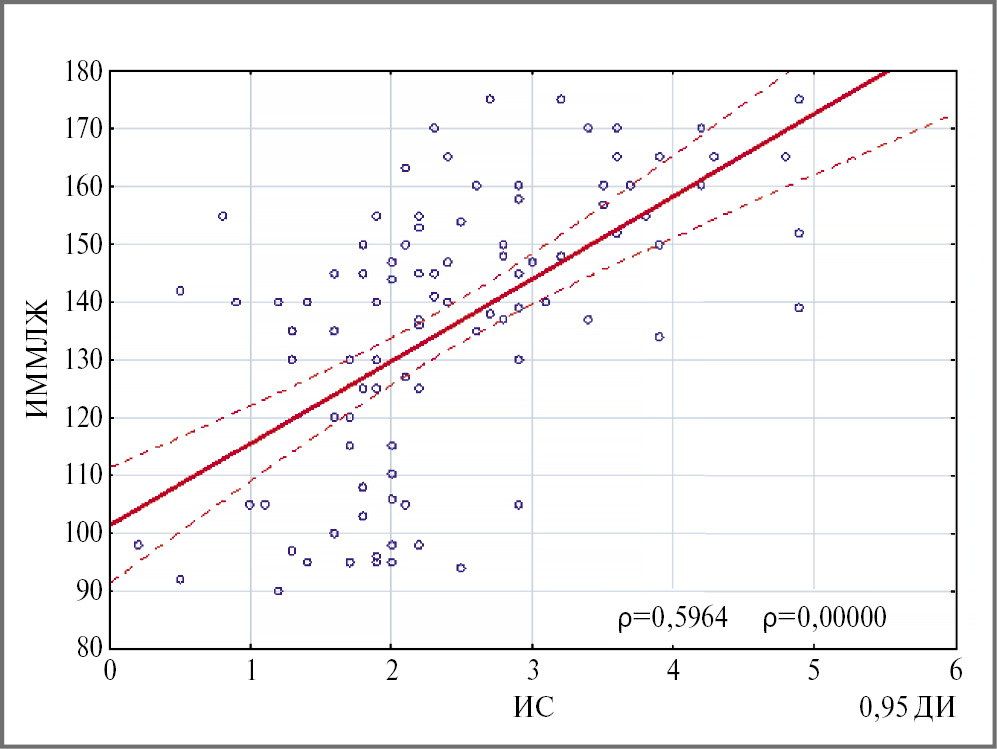 Рис. 1. Взаимосвязи между уровнем ИС и ИММЛЖ в группе больных в целом (n=115). Выявлена сильная прямая корреляция, особенно выраженная в группе высоких концентраций ИС и тяжелых изменений ИММЛЖ (анализ по Спирмену).