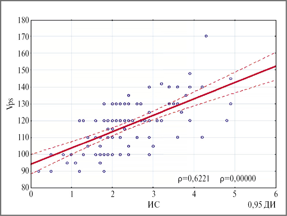 Рис. 2. Взаимосвязи между уровнем ИС и Vps в группе больных в целом (n=115). Выявлена сильная прямая корреляция, особенно выраженная в группе высоких концентрации ИС и тяжелых изменений Vps (анализ по Спирмену).