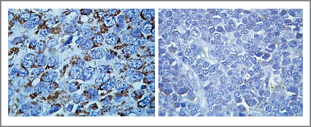Рис. 1. Лимфатический узел. ИГХ-окраска антителом к AIF: a – высокая экспрессия (≥57%); b – низкая экспрессия (<57%), ×1000.