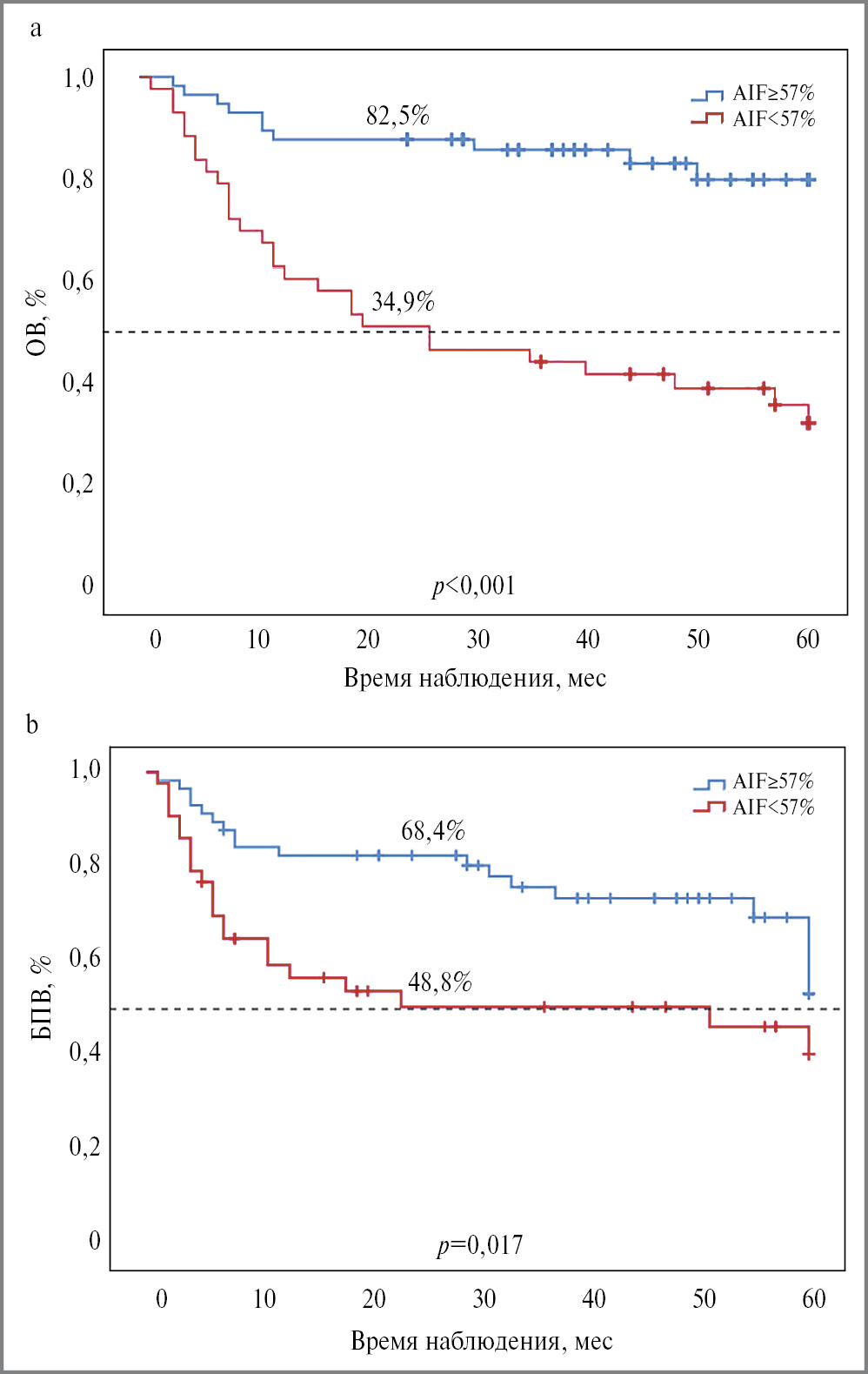 Материалы и методы. В ретроспективное исследование включены 100 пациентов с ДВККЛ. Больные получали стандартную терапию 1-й линии по схеме R-CHOP. Выполнены гистологические, иммуногистохимические исследования лимфоузлов и/или других вовлеченных в патологический процесс органов. Проведен морфометрический подсчет данных с определением процентной доли опухолевых клеток, экспрессирующих AIF. С помощью ROC-анализа установлено пороговое значение, равное 57% опухолевых клеток, экспрессирующих AIF. С учетом порога пациентов разделили на группы с высоким (надпороговым) и низким (подпороговым) уровнем белка. Расчет общей (ОВ) и беспрогрессивной выживаемости (БПВ) производили с помощью метода Каплана–Мейера с графическим построением соответствующих кривых, уровни факторов сравнивали с помощью критерия log-rank test. Независимое влияние факторов на течение ДВККЛ определяли с помощью многофакторного анализа регрессии Кокса.