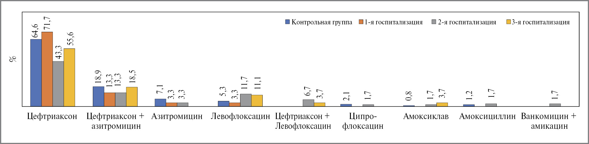 В период госпитализации 243 (88%) пациентам контрольной группы назначена антибиотикотерапия: 157 (64,6%) пациентам – цефтриаксон, 17 (7,1%) – азитромицин, 13 (5,3%) – левофлоксацин, 5 (2,1%) – ципрофлоксацин, 3 (1,2%) – амоксициллин, 2 (0,8%) – амоксициллин/клавулановая кислота, 46 (18,9%) – комбинация цефтриаксона с азитромицином.