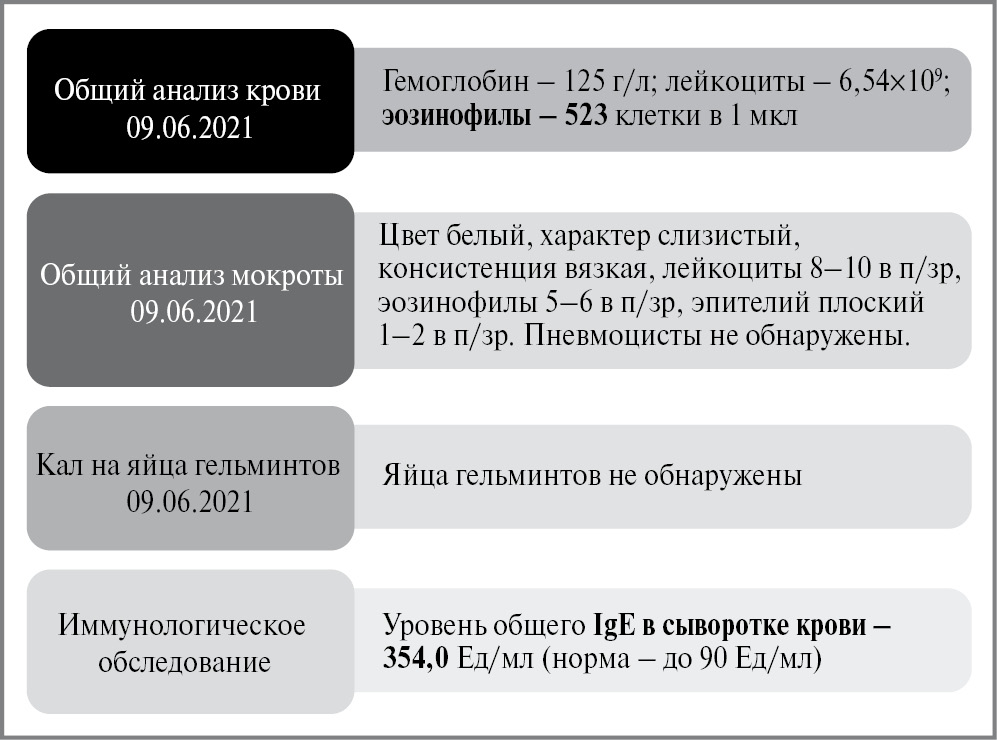 Результаты обследования. При проведении общего анализа крови с подсчетом абсолютного числа эозинофилов в периферической крови (абсолютное число эозинофилов = лейкоциты × эозинофилы / 100) установлена эозинофилия крови – 523 кл/мкл, повышенный уровень общего IgE в сыворотке крови до 354 Ед/мл (рис. 1).