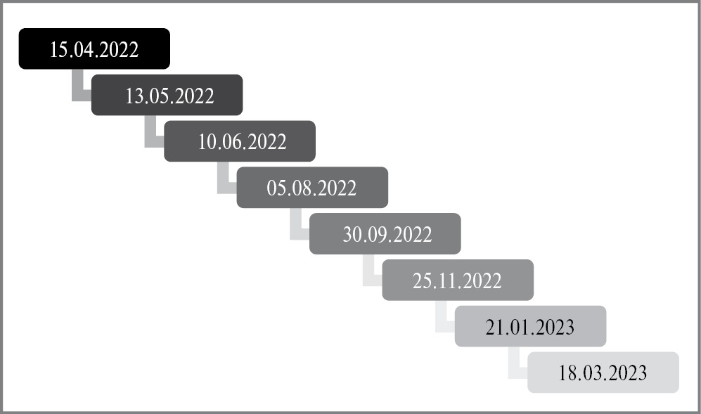 Учитывая наступление возраста пациента 18 лет, тяжесть течения заболевания, отсутствие контроля заболевания на 5-й ступени терапии БА (по GINA 2021), наличие обострений до 2–3 раз за наблюдаемый период, наличие персистирующей эозинофилии (эозинофилы – 428 кл/мкл), прогрессивное ухудшение обструктивных изменений, развитие признаков дыхательной недостаточности, принято решение о биологическом переключении – отмене омализумаба 600 мг и назначении препарата бенрализумаб 30 мг/мл. Первая инъекция бенрализумаба 30 мг/1 мл введена 15.04.2022. В последующем пациент получал лекарственное средство в соответствии с инструкцией к применению. Первые 3 инъекции – ежемесячно подкожно, остальные – через 8 нед на протяжении 52 нед. Переключен на бенрализумаб 30 мг/1 мл – первая инъекция 15.04.2022 (рис. 2).