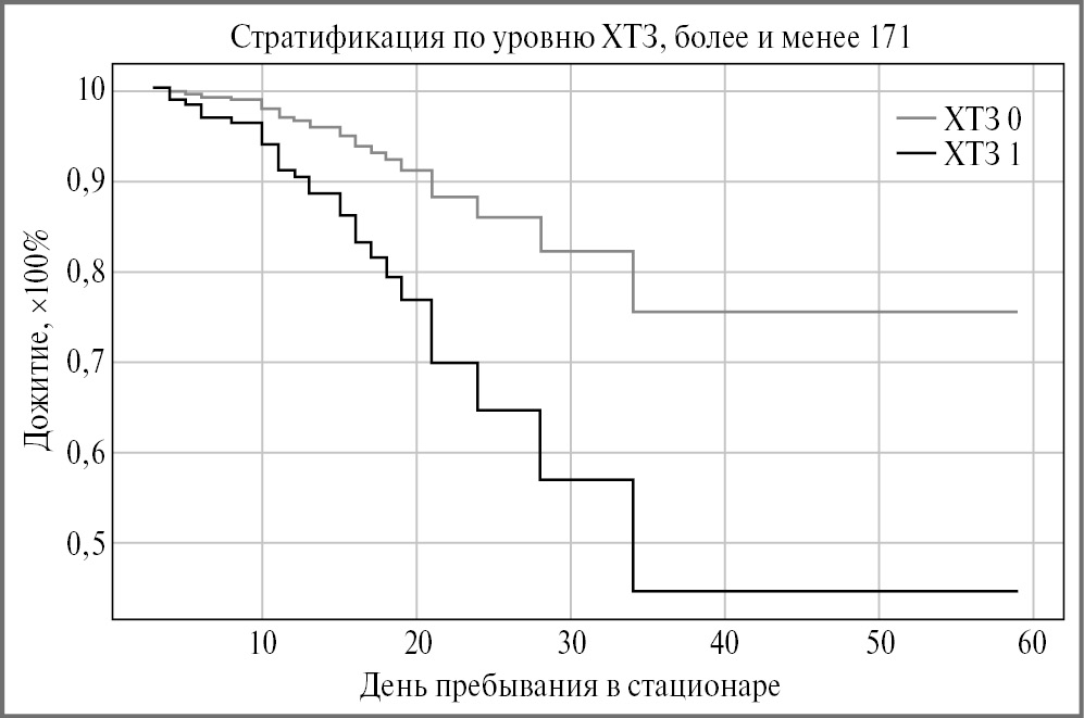 Рис. 1. Кривая Каплана–Мейера, показывающая выживаемость пациентов с коронавирусной инфекцией с уровнем ХТЗ выше порогового значения 171 нмоль/мл/ч. Примечание. ХТЗ 0 – ХТЗ<171 нмоль/ч/мл, ХТЗ 1 – ХТЗ≥171 нмоль/ч/мл.