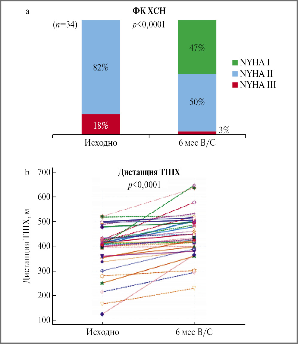 Исходно и через 6 мес наблюдения проводилось общеклиническое обследование с определением ФК ХСН по классификации Нью-Йоркской кардиологической ассоциации, проведением теста 6-минутной ходьбы (ТШХ) и оценкой качества жизни с помощью Миннесотского опросника качества жизни больных с ХСН (MLHFQ). Всем пациентам проводили электрокардиографию в 12 отведениях, транс- торакальную эхокардиографию, рентгенографию органов грудной клетки, магнитно-резонансную томографию (МРТ) сердца (с целью исключения кардиомиопатий иной этиологии), клинический анализ крови, биохимический анализ крови с определением концентрации креатинина, СКФ, рассчитываемой по формуле CKD-EPI, калия, натрия, глюкозы, печеночных трансаминаз, показателей липидного профиля, общего белка, альбумина, определение концентрации N-терминального фрагмента предшественника мозгового натрийуретического пептида (NT-proBNP) и растворимого ST2-рецептора (sST2).