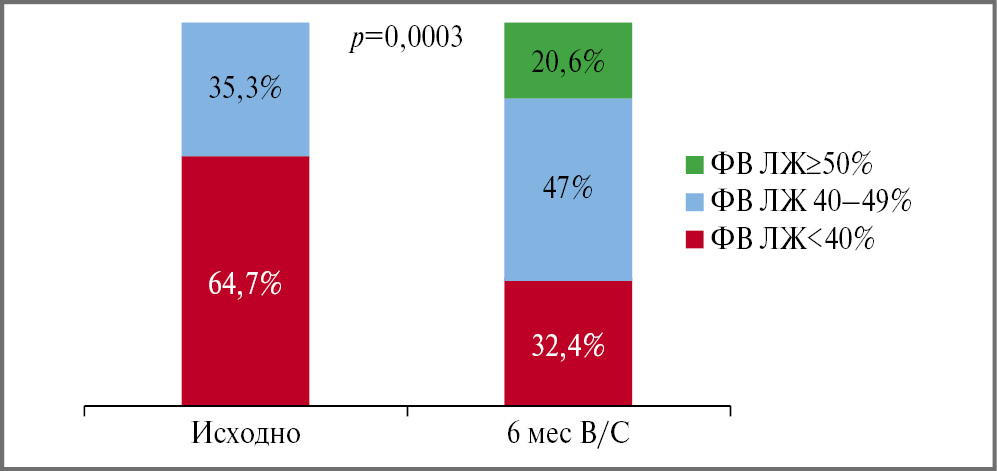 При оценке эхокардиографических показателей через 6 мес терапии В+С отмечено статистически значимое улучшение параметров ремоделирования левого предсердия (ЛП) и ЛЖ, систолической и диастолической функции ЛЖ (см. табл. 3). Повышение ФВ ЛЖ отмечено у 21 (61,8%) пациента: на 5–9% – у 12 человек, на 10% и более – у 9 человек. Через 6 мес наблюдения число пациентов с низкой ФВ ЛЖ сократилось в 2 раза, абсолютное значение ФВ ЛЖ превысило 50% у 7 (20,6%) пациентов (рис. 2).