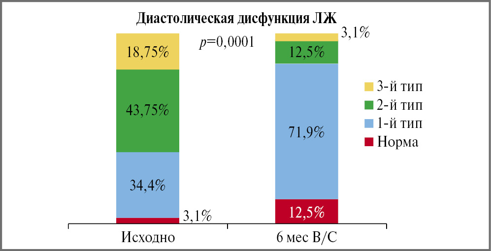 Рис. 3. Динамика доли больных с различным типом диастолической дисфункции ЛЖ на фоне 6 мес терапии В+С (анализ проведен у пациентов с синусовым ритмом).