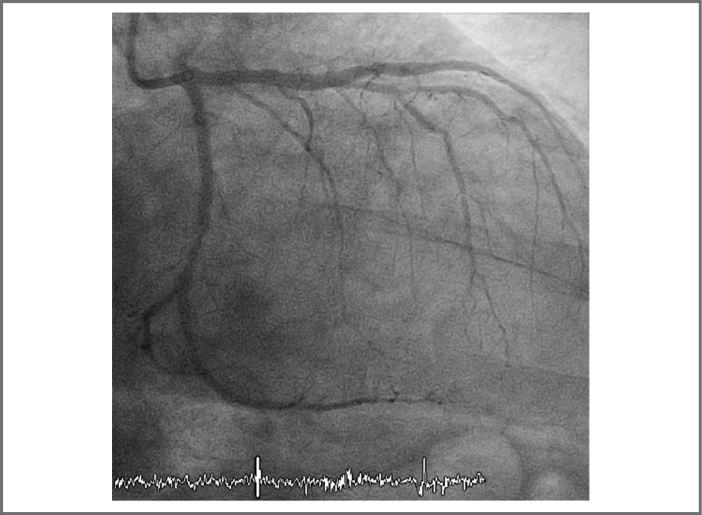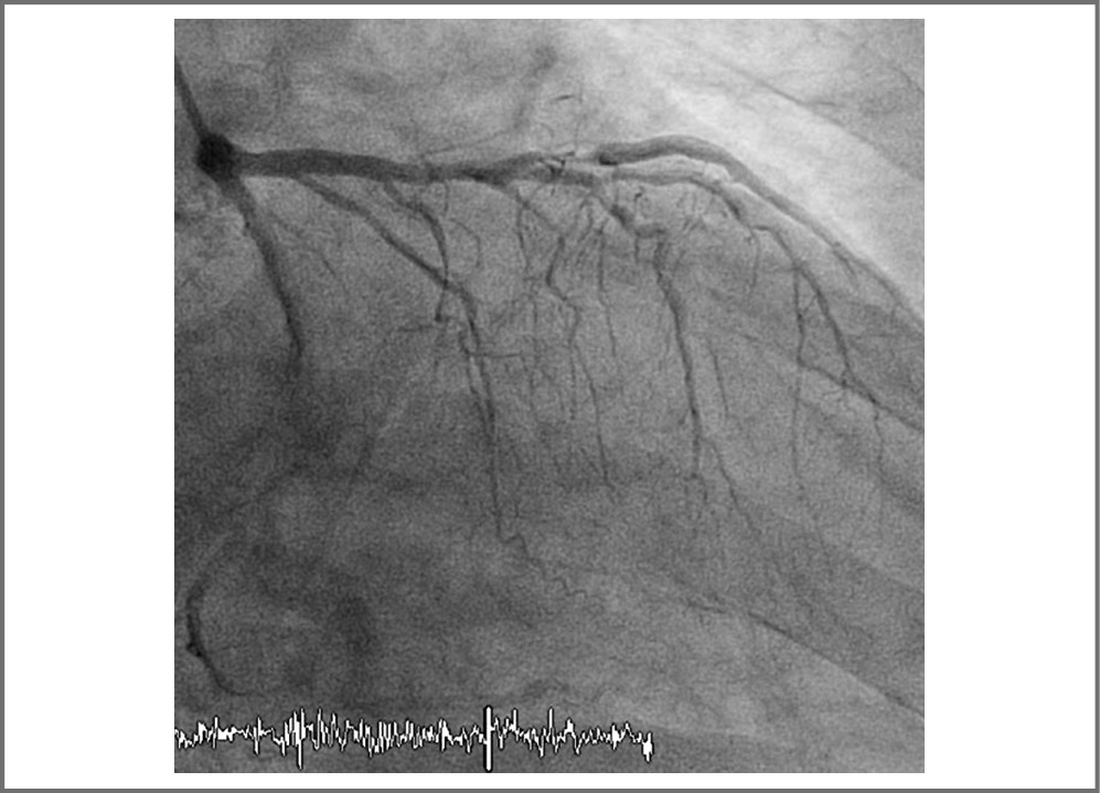 Пациент госпитализирован в региональный сосудис- тый центр. В связи с отсутствием признаков реперфузии на ЭКГ выполнена экстренная коронароангиография (КАГ), при которой выявлена окклюзия передней нисходящей артерии (ПНА) в проксимальном сегменте. Одномоментно выполнено ЧКВ со стентированием ПНА двумя стентами с лекарственным покрытием (рис. 1, 2). Процедура прошла без осложнений, кровоток по ПНА после вмешательства – TIMI III. По данным ЭКГ после вмешательства отмечаются признаки реперфузии в виде снижения элеваций сегмента ST.