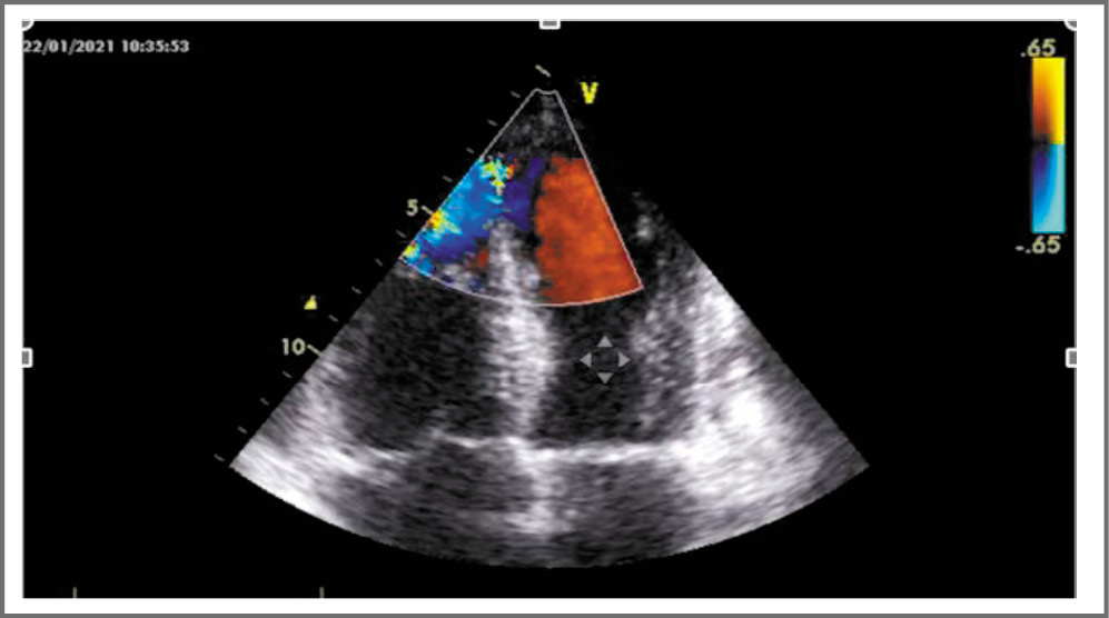 На следующий день выполнена ЭхоКГ, при которой впервые выявлен дефект МЖП в области верхушки диаметром 13 мм со сбросом крови слева направо (рис. 3). Фракция выброса левого желудочка – 42,4%, акинез верхушечных сегментов всех стенок.