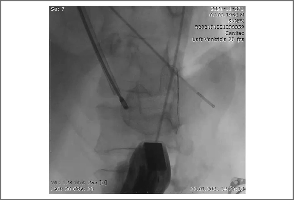 Учитывая тяжесть состояния пациента, консилиумом Heart Team принято решение об экстренном выполнении закрытия разрыва МЖП эндоваскулярным путем. Пациент переведен в рентгеноперационную. Продолжалась вазопрессорная поддержка норадреналином. Проведена вентрикулография. Определен размер разрыва МЖП – 2,1 см. Выполнено эндоваскулярное закрытие МЖП ОМПП – Flex II ASD Occluder (рис. 4). При ультразвуковом контроле положение окклюдера удовлетворительное, определялся минимальный парапротезный сброс крови слева направо, в полости перикарда свободной жидкости не выявлено. Гемодинамические показатели в пределах нормальных значений (артериальное давление – АД – 105/70 мм рт. ст., среднее – АД 71 мм рт. ст.). Однако во время осуществления гемостаза и наложения давящих повязок у больного наблюдались внезапная остановка дыхания, электромеханическая диссоциация с переходом в асистолию. Проводились реанимационные мероприятия, включая искусственную вентиляцию легких, в течение 35 мин. При повторном ЭхоКГ-контроле – окклюдер стоит в прежней позиции, в полости перикарда визуализируется большое количество свободной жидкости со сдавлением правых камер сердца. Выполнен перикардиоцентез, начато удаление крови из полости перикарда со скоростью активного удаления более 100 мл/мин. При ультразвуковом контроле в полости перикарда сохранялось прежнее количество жидкости.