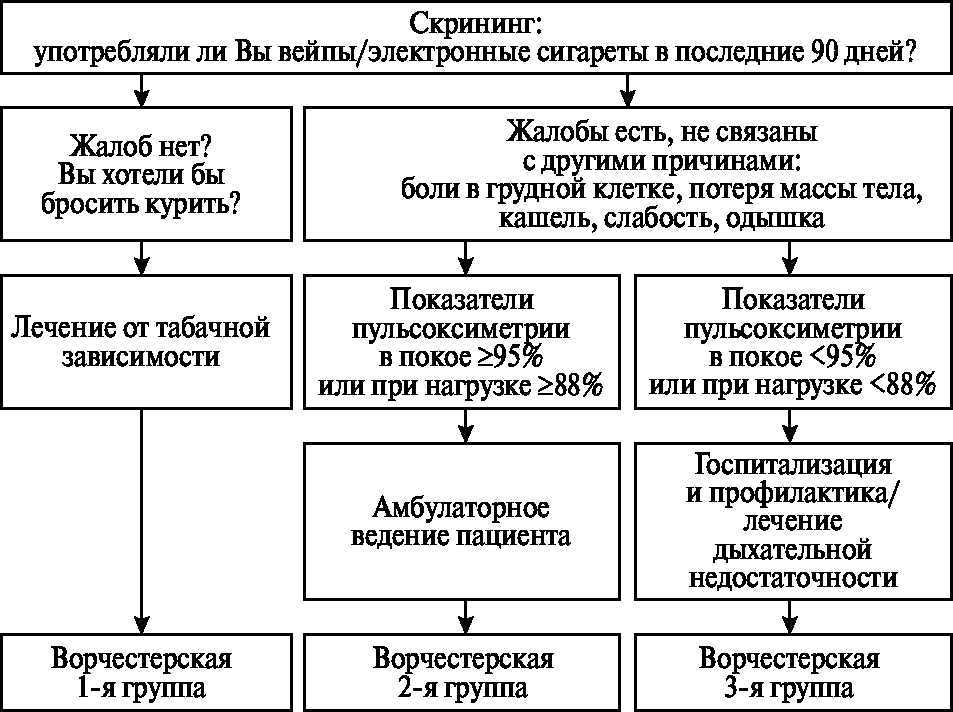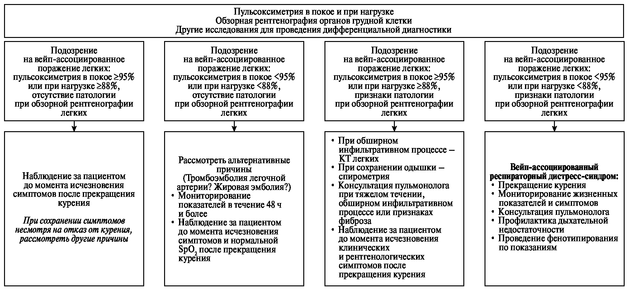 Данная классификация, учитывающая данные пульсоксиметрии, позволяет определить тактику ведения вейперов, показания для госпитализации, необходимый набор исследований и выбор методов лечения, что представлено на рис. 1, 2 [31].