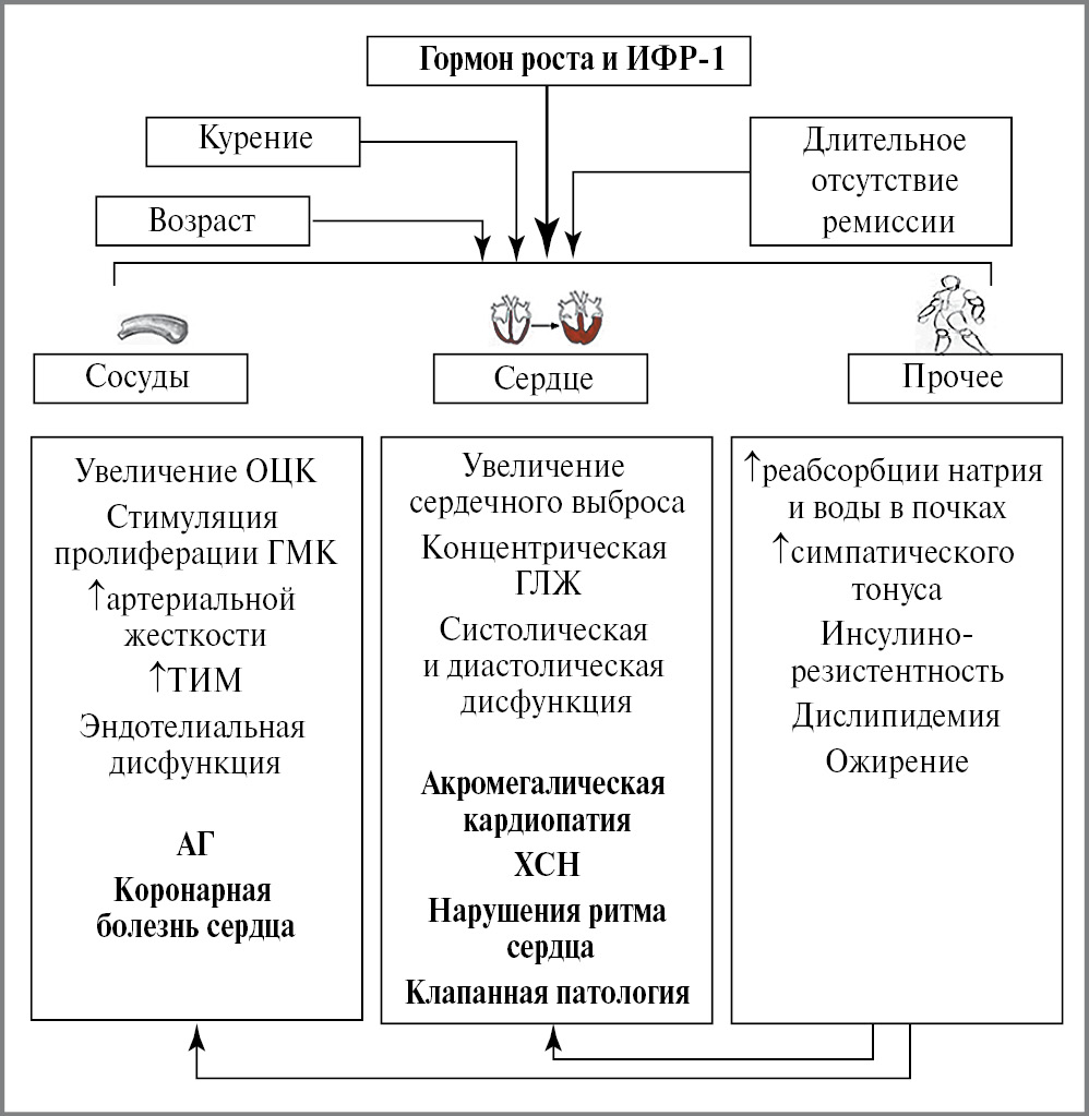 Хроническая гиперсекреция гормона роста и/или избыток ИФР-1, усугубляемая влиянием сопутствующих факторов, таких как продолжительность заболевания в отсутствие ремиссии, возраст и курение, приводит к увеличению объема циркулирующей крови, стимуляции пролиферации гладкомышечных клеток, повышению жесткости артерий и эндотелиальной дисфункции, увеличению толщины комплекса интима–медиа, что в свою очередь способствует развитию АГ и ишемической болезни сердца. Повышенная чувствительность сосудов к ангиотензину II, задержка натрия и воды, а также увеличение сердечного выброса приводят к повышению периферического сопротивления и усугубляют течение АГ. Увеличение сердечного выброса, концентрическая ГЛЖ, а также систолическая и диастолическая дисфункция являются ключевыми моментами в развитии акромегалической кардиомиопатии, которая в конечном итоге приводит к ХСН. Другие типичные изменения у пациентов с акромегалией включают поражение клапанов, характерную эктазию восходящего отдела аорты, развитие тяжелых форм синдрома обструктивного апноэ–гипопноэ сна (СОАС). Инсулинорезистентность, ожирение и дислипидемия могут также способствовать прогрессированию сердечно-сосудистых изменений (рис. 1).