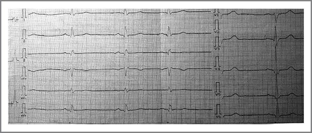 Рис. 3. ЭКГ пациента Л. в 2017 г. Скорость записи – 50 мм/с, вольтаж – 10 мм/мВ. Синусовый ритм с ЧСС – 53 в минуту, АВ-блокада 1-й степени, продолжительность QRS – 120 мс.