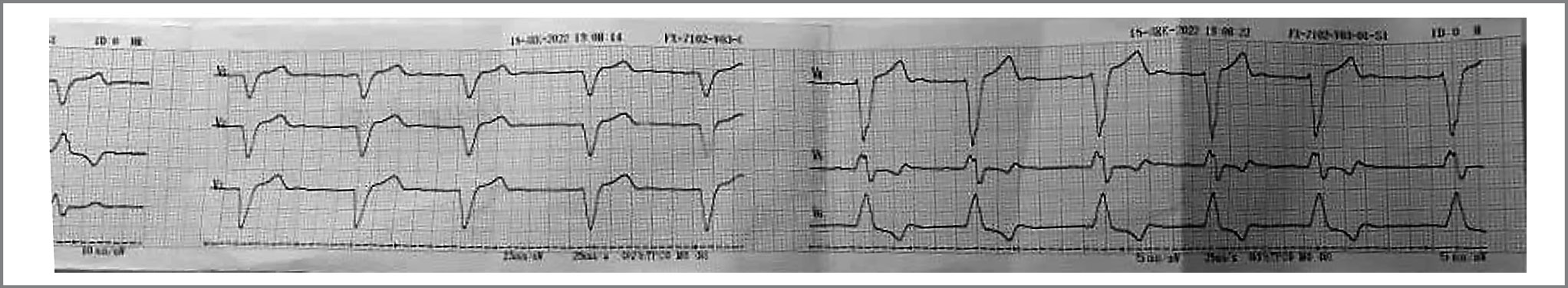 5. Fig. 4. ECG of patient L. in 2022. Recording speed – 25 mm/s, voltage – 5 mm/mV. Sinus bradycardia with heart rate of 50 per minute, 1st degree AV block, CLBBB, QRS duration 120 ms, ECG signs of LVH in CLBBB (Kafka, Baranowski criteria).